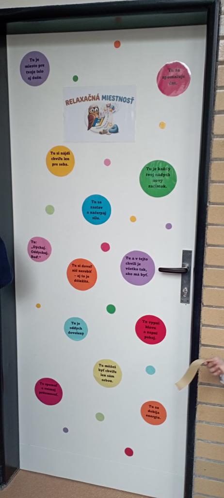 Relaxačná miestnosť má slúžiť na poskytnutie pozitívne naladeného prostredia, ktoré má funkciu relaxačnú, poznávaciu a interakčnú. Aktívny, ale aj pasívny pobyt v miestnosti môže pomôcť u žiaka redukovať stres. Miestnosť rešpektuje senzorické potreby žiaka, či už v zmysle eliminácie rušivých podnetov, alebo naopak v zmysle senzorickej stimulácie, ktorá žiaka podnecuje, podporuje jeho vývin, aktivizuje ho.