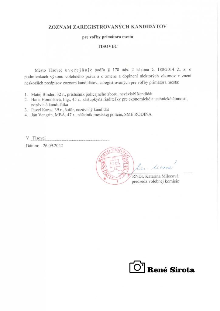 Mesto Tisovec uverejňuje podľa § 178 ods. 2 zákona č. 180/2014 Z. z. o podmienkach výkonu volebného práva a o zmene a doplnení niektorých zákonov v znení neskorších predpisov zoznam kandidátov, zaregistrovaných pre voľby primátora MESTA TISOVEC.