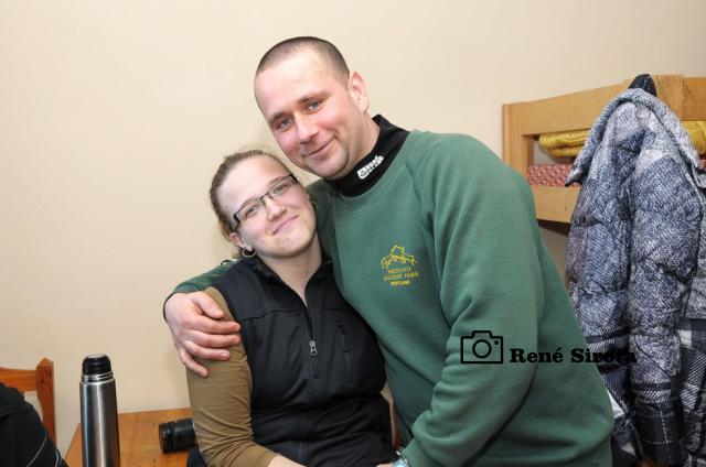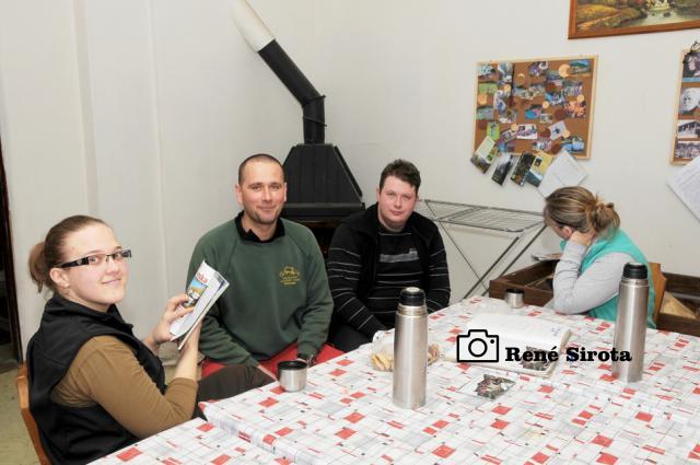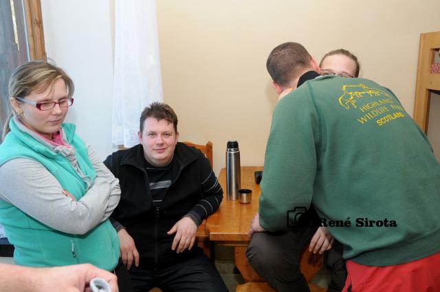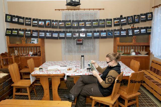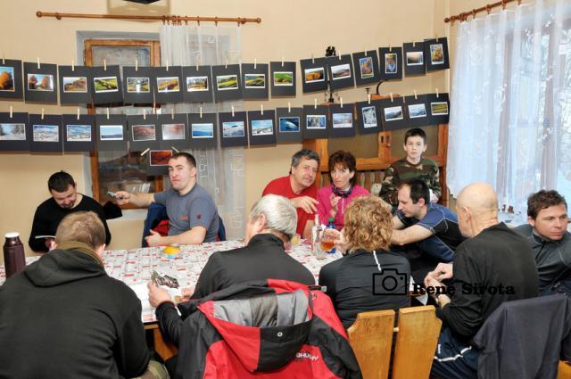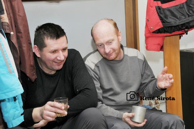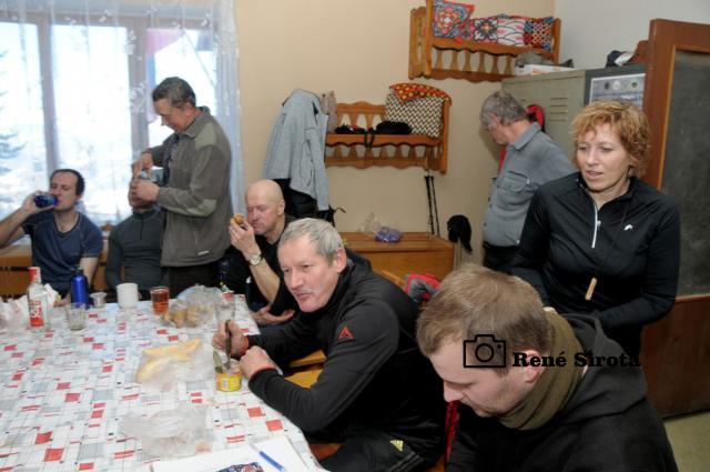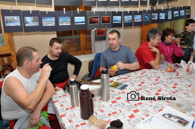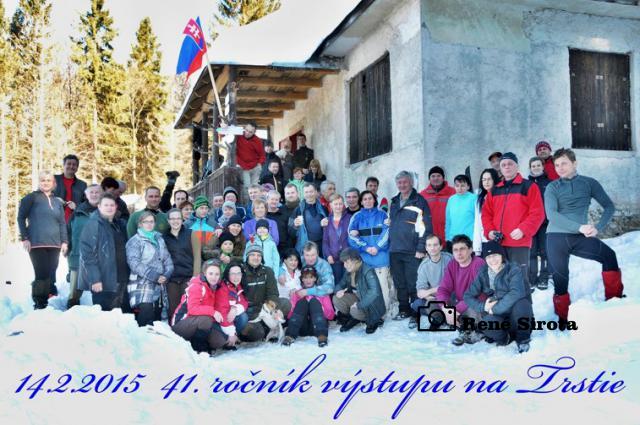 Pohľad z okna chaty poteší modrá obloha s krásnou panorámou Rudohoria a Nízkych Tatier s vrcholkami osvietenými vychádzajúcim slnkom. Rýchle raňajky, chytro postaviť vodu na výstupový čaj a odlopatovať ešte sneh z lavičiek pri ohnisku. Prichádzajú ďalší členovia organizačného tímu, chatár Rodan s manželkou Zuzkou, Martin s Miškou a Milan Slabej. Hneď sa ujímajú ďalších príprav, vešajú výstavu fotiek Milana Slabeja, ešte nejaké to drevo a vodu nanosiť a po desiatej už vítame prvých turistov. Čaj s rumom, bez rumu, alebo rum bez čaju? Pýtame sa už automaticky všetkých prichádzajúcich, odpovede sú väčšinou rovnaké. Po počiatočnom vydýchaní sa začnú debaty krútiť okolo vydareného počasia a peknej zimnej atmosféry, preberajú sa rôzne zážitky z hôr, aj bežného života. Chata je po roku znova plná na prasknutie, okrem nášho čaju sa pijú a pojedajú ešte všelijaké domáce špeciality a počas oddychu si turisti všade v okolí pece sušia premočené a prepotené veci. Stretáme ľudí, ktorých sme niektorých aj roky nevideli, na moje prekvapenie pred chatou vidím spolužiačku zo strednej, s ktorou som sa naposledy videl asi pred 15 rokmi. Mnohí s obdivom pozerajú na vynovené vnútro chaty, ktoré po desiatkach rokov prešlo omladením, za čo chatárovi vyslovujú nemalú pochvalu. Keď to vyzerá, že už nejako viacej ľudí nepríde a zatiaľ sa ich iba málo pobralo späť, fotograf všetkých vyženie na povinnú spoločnú fotku. Po nej sa už časť turistov lúči a odchádzajú po hrebeni až do Hnúšte, zvyšní sa vracajú do tepla chaty, aby načerpali ešte nejaké sily na zostup, je naozaj krásny zimný deň, tak sa ani neponáhľajú. Čas je však neúprosný a okolo tretej sa s nami lúčia poslední, čo chceli ísť dole ešte dnes. Polhodinu po nich vítame dvojicu opozdilcov, ktorých nakoniec prevravíme ostať na chate do druhého dňa a ešte aj tak nie sú poslední. Už za úplnej tmy prichádza kamarát, ktorý nemohol dôjsť skôr. Nakoniec na noc ostávame ôsmi, večer sa rozohráva kartový turnaj, ktorý sa pretiahne do hlbokej noci. Nedeľné ráno je rovnako pekné, už sa ani nenáhlime, v pokoji poupratujeme chatu, ktorú okolo obeda zamkýnam a oficiálne ukončujem 41. Zimný výstup na Trstie.